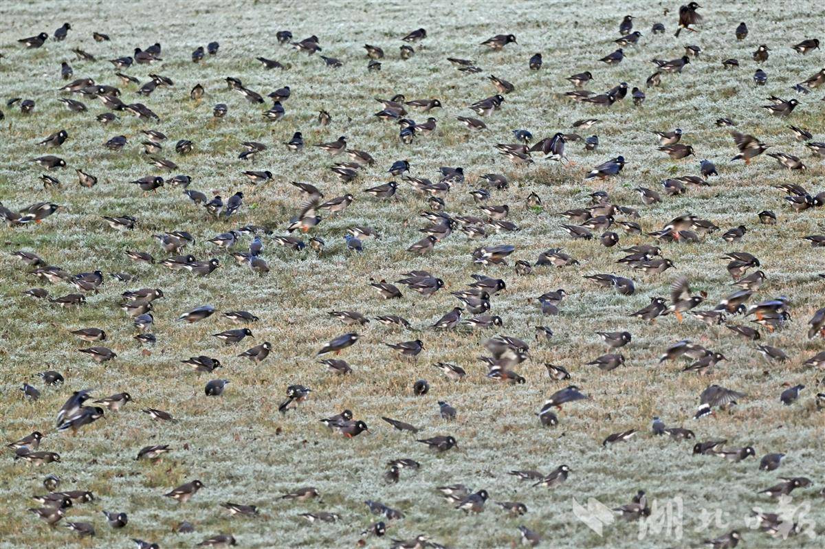 11月21日凌晨,宜昌卷桥河湿地一片热闹。成群的丝光椋鸟在这里自由自在地飞翔、嬉戏。树林里、草地上、溪边,随处可见它们敏捷的身影。